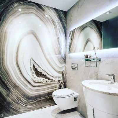 Transform your bathroom walls with perfectly cut stone, including marble and granite, or opt for glossy smooth porcelain tiles.