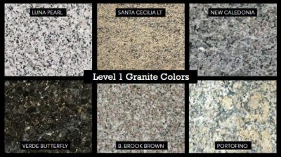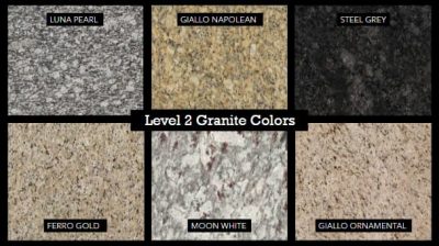 Pick your Level 1 granite countertops for a seamless kitchen reno. This is the most standard option and comes in a variety of beautifully speckled patterns.