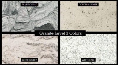 Get the most elegant kitchen countertops with our luxury Level 3 granite countertops. These high quality options are clean, bright, and absolutely gorgeous!